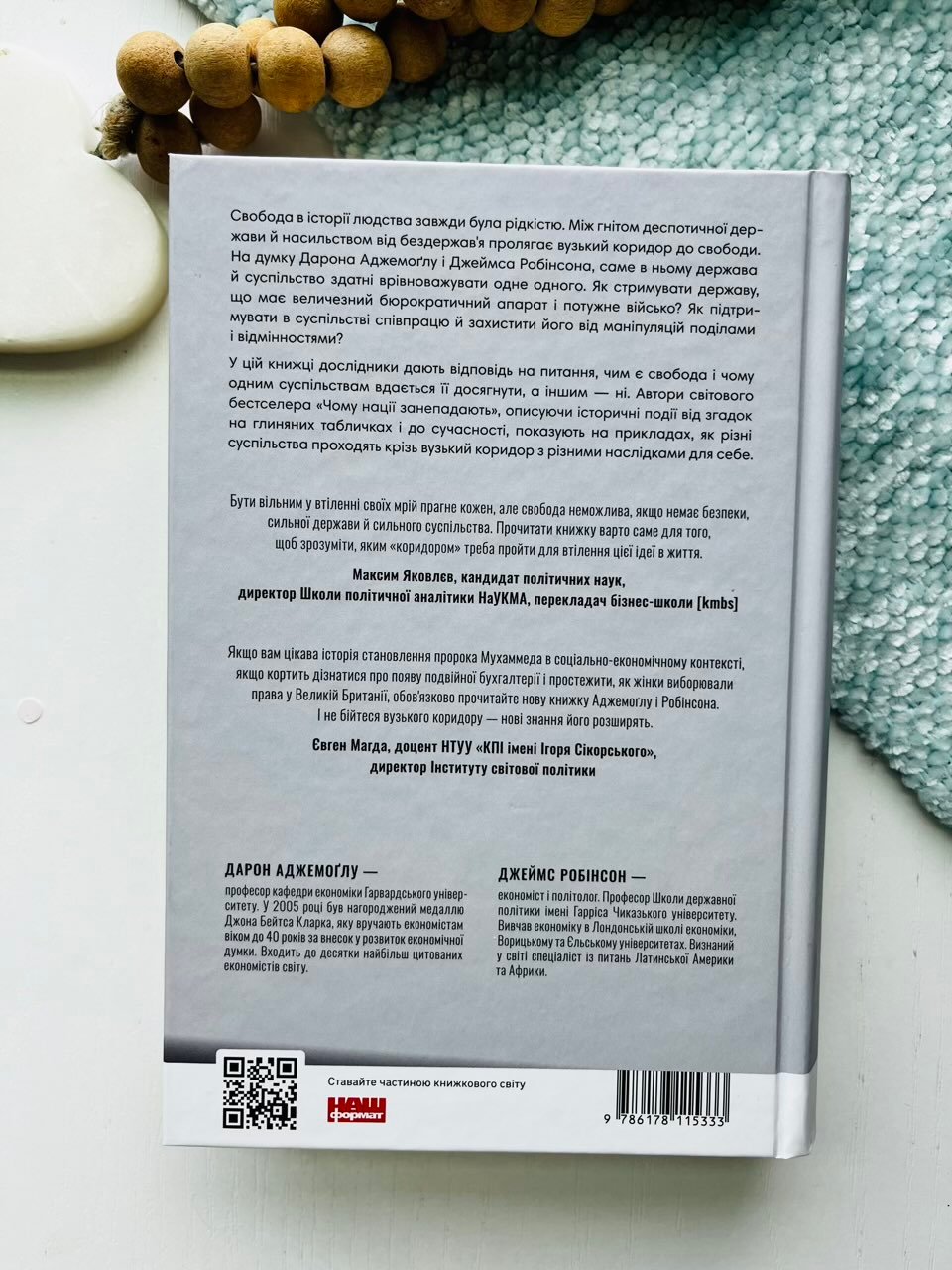 Свобода в історії людства завжди була рідкістю. Між гнітом деспотичної держави й насильством від бездержав’я пролягає вузький коридор до свободи. На думку Дарона Аджемоґлу і Джеймса Робінсона, саме в ньому держава й суспільство мають врівноважувати одне одного. Як стримувати державу, що має величезний бюрократичний апарат і потужне військо? Як підтримувати в суспільстві співпрацю й захистити його від маніпуляцій поділами і відмінностями?