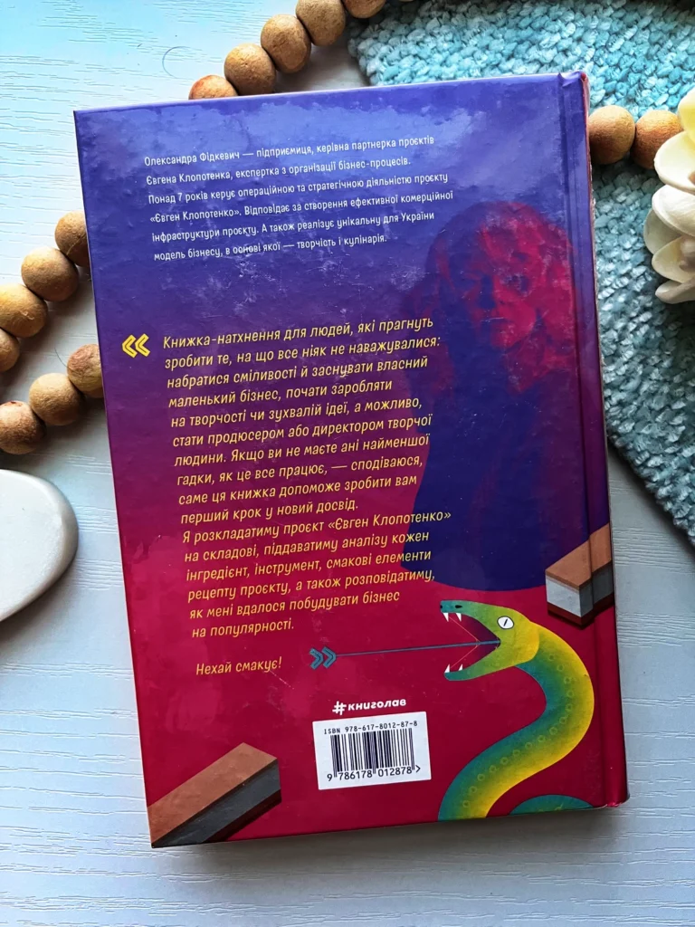Як побудувати бізнес на творчості в українських реаліях? Як заробляти на своїй креативності? Олександра Фідкевич, директорка проєкту «Євген Клопотенко» має у цьому успішний досвід і написала про це книжку. «Як начинити гадюку салом» – це покрокова інструкція, з чого починати розвиток власної справи чи як стати професійним продюсером та заробляти на творчості. На прикладі проєктів Євгена Клопотенка, авторка пояснює: – як вибудувати свою бізнес-модель; – як досліджувати свої цільові аудиторії і як з ними працювати; – чому важливо знати свої ключові ресурси, визначити свою місію та цінності і як це зробити; – які методи використовувати, щоб досягти бажаних результатів; – про роль соцмереж у побудові бізнесу і як до них підходити; – як працювати зі спонсорами і що потрібно підготувати завчасно; – про стратегічне планування і бюджет; – як сформувати команду мрії і як побудувати здорові відносини з колегами; – про роль піару та як створити вдалу комунікаційну стратегію; – як реагувати на хейт та як працювати з фанами; – як поводитися у кризових ситуаціях; зрештою, – як смакувати результатами. Водночас це дуже відверта розповідь, сповнена гумору, натхнення та щирості. Олександра Фідкевич говорить не тільки про успіхи, а й про труднощі, ділиться історіями із закулісся , які відкривають весь процес створення процвітаючого бізнесу. «Я зрозуміла, що хочу написати книжку-натхнення для тих, хто прагне зробити те, на що ніяк не наважувався: набратися сміливості й заснувати власний маленький бізнес, почати заробляти на творчості чи зухвалій ідеї, а можливо, стати продюсером або директором творчої людини. Якщо ви не маєте ані найменшої гадки, як усе це працює, — сподіваюся, саме ця книжка допоможе вам зробити перший крок у новий досвід.