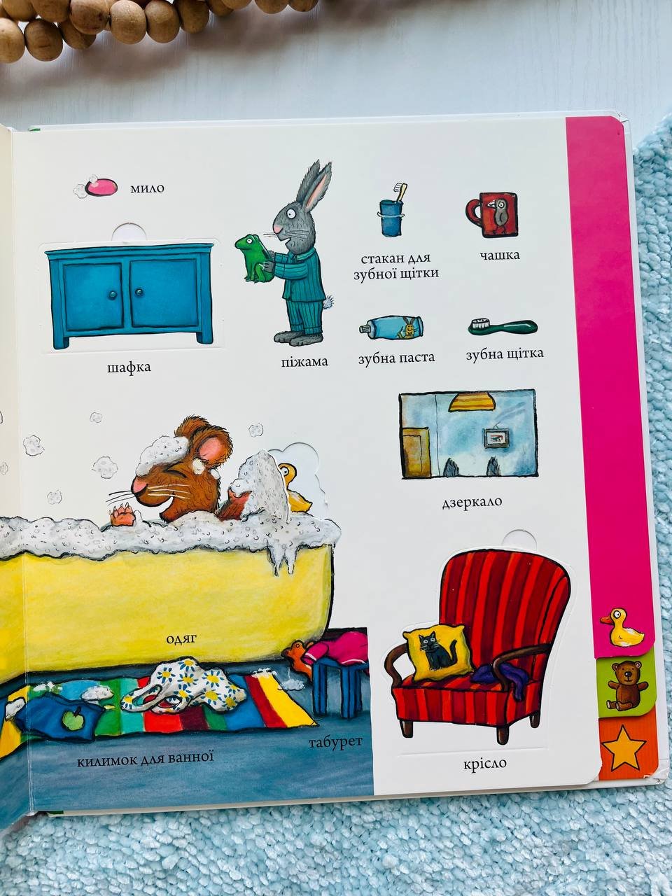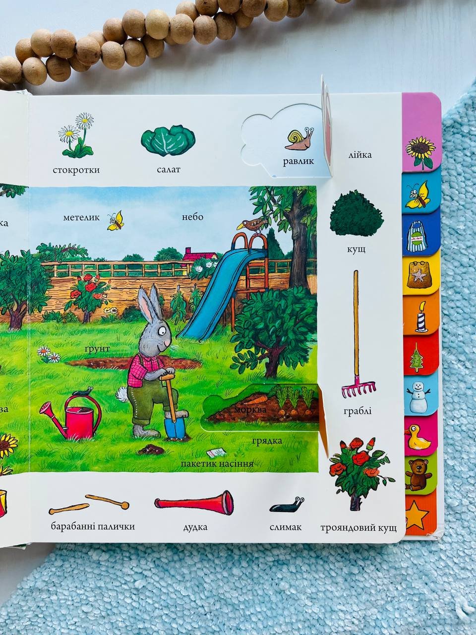 Ця яскрава й барвиста книжка з віконцями відразу приверне увагу малюка, і він не захоче випускати її з рук. А сотні картинок і слів заохотять малечу говорити.