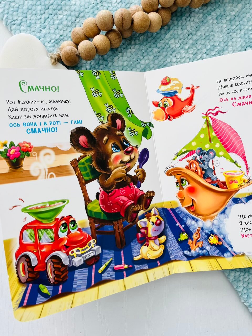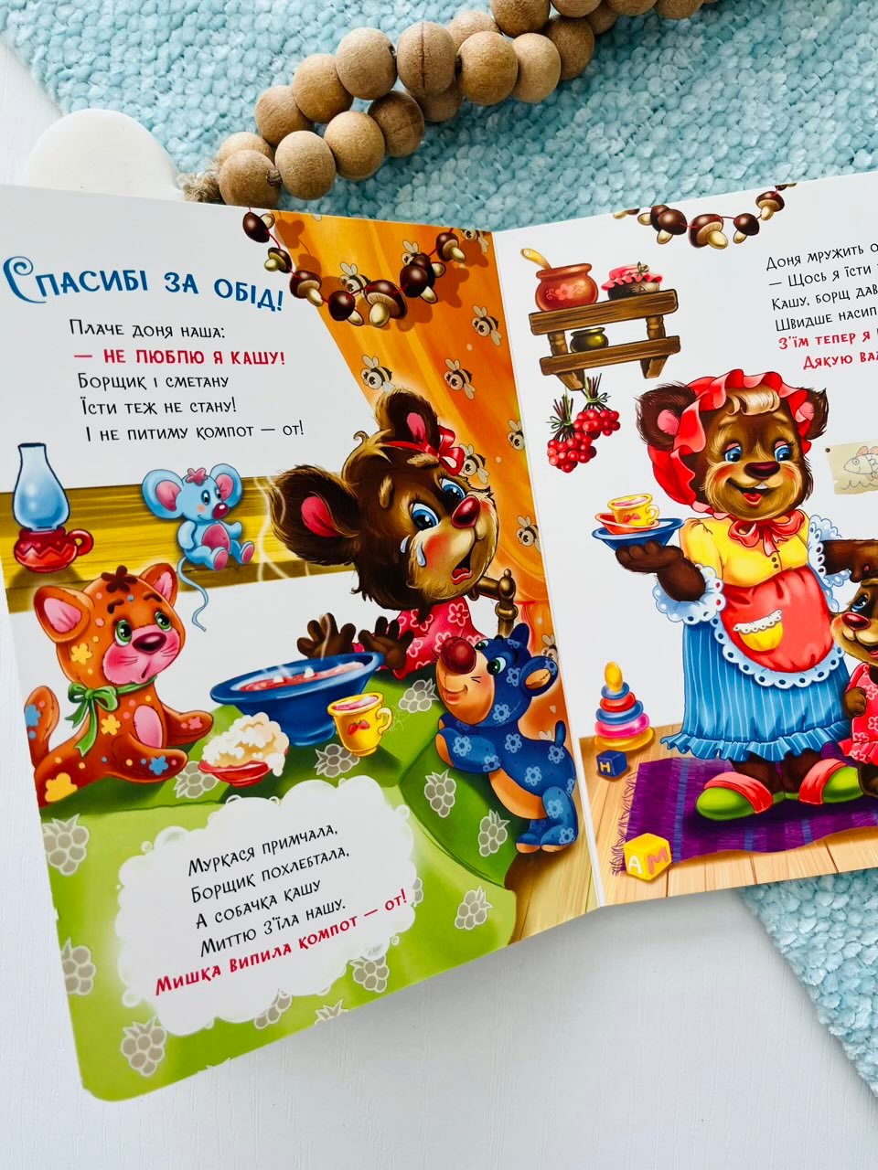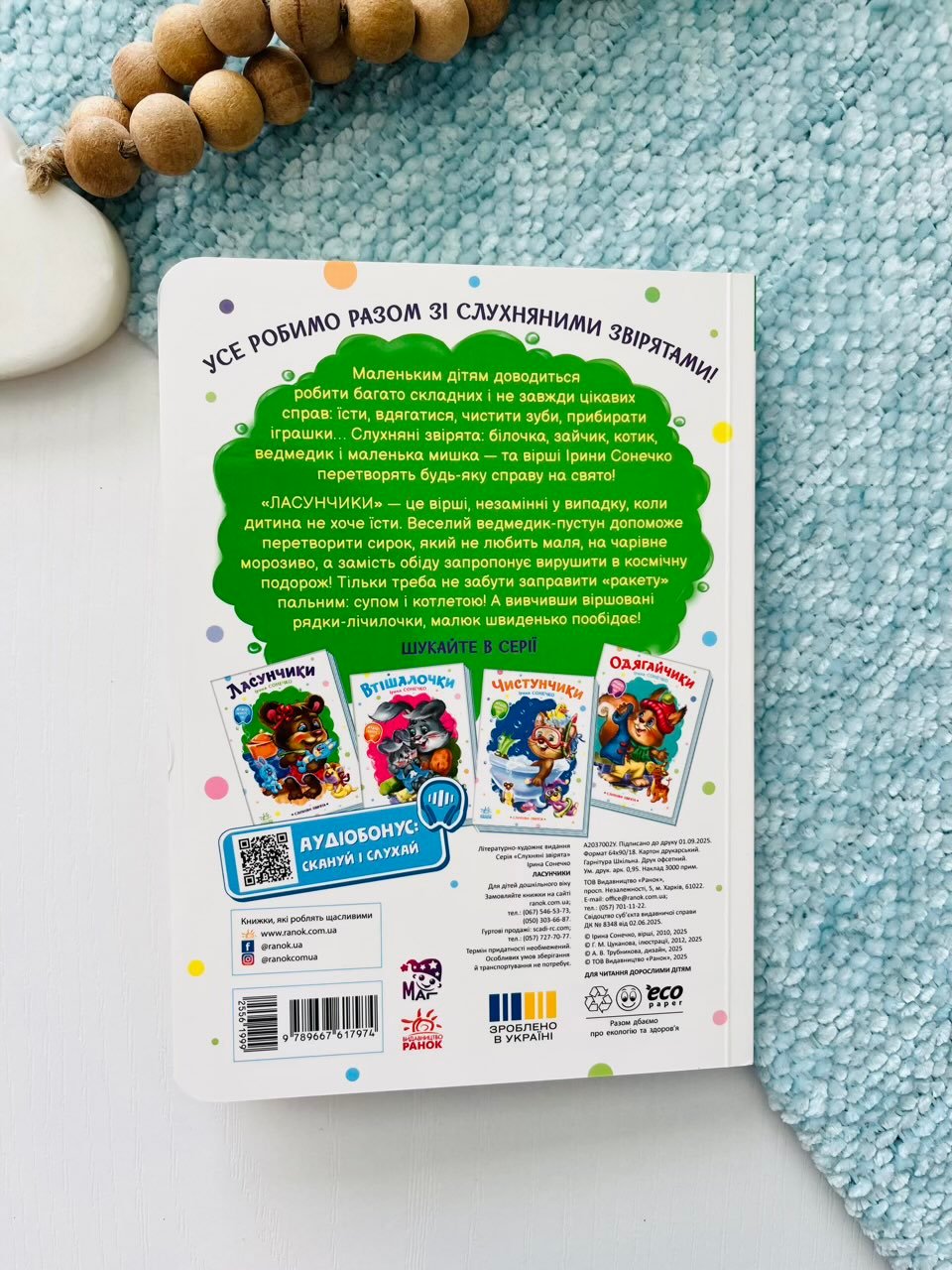 «Ласунчики!» ― це вірші, незамінні у випадку, коли дитина не хоче їсти. Веселий ведмедик-пустун допоможе перетворити сирок, який не любить маля, на чарівне морозиво, а замість обіду запропонує вирушити в космічну подорож! Тільки треба не забути заправити «ракету» пальним: супом і котлетою! А вивчивши віршовані рядки-лічилочки, малюк швиденько пообідає!