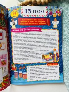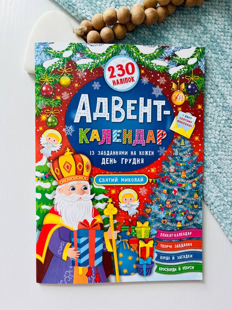 Разом із цією книжкою малюк підготується до зимових свят та проведе час в очікуванні Нового року цікаво та з користю. Видання містить великий плакат-календар на грудень, творчі й розвивальні завдання на кожен день місяця, 230 яскравих наліпок для виконання завдань і заповнення календаря, а також лист святому Миколаю та лист для планів на наступний рік. Видання призначене для спільної роботи дорослих з дітьми дошкільного та молодшого шкільного віку. Для чого потрібний адвент-календарОсь і розпочалася зимова пора з низкою чарівних свят! Попереду день святого Миколая, католицьке Різдво й найочікуваніше свято — Новий рік! Щоб перетворити довге очікування на