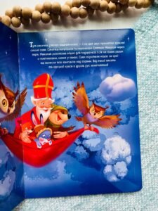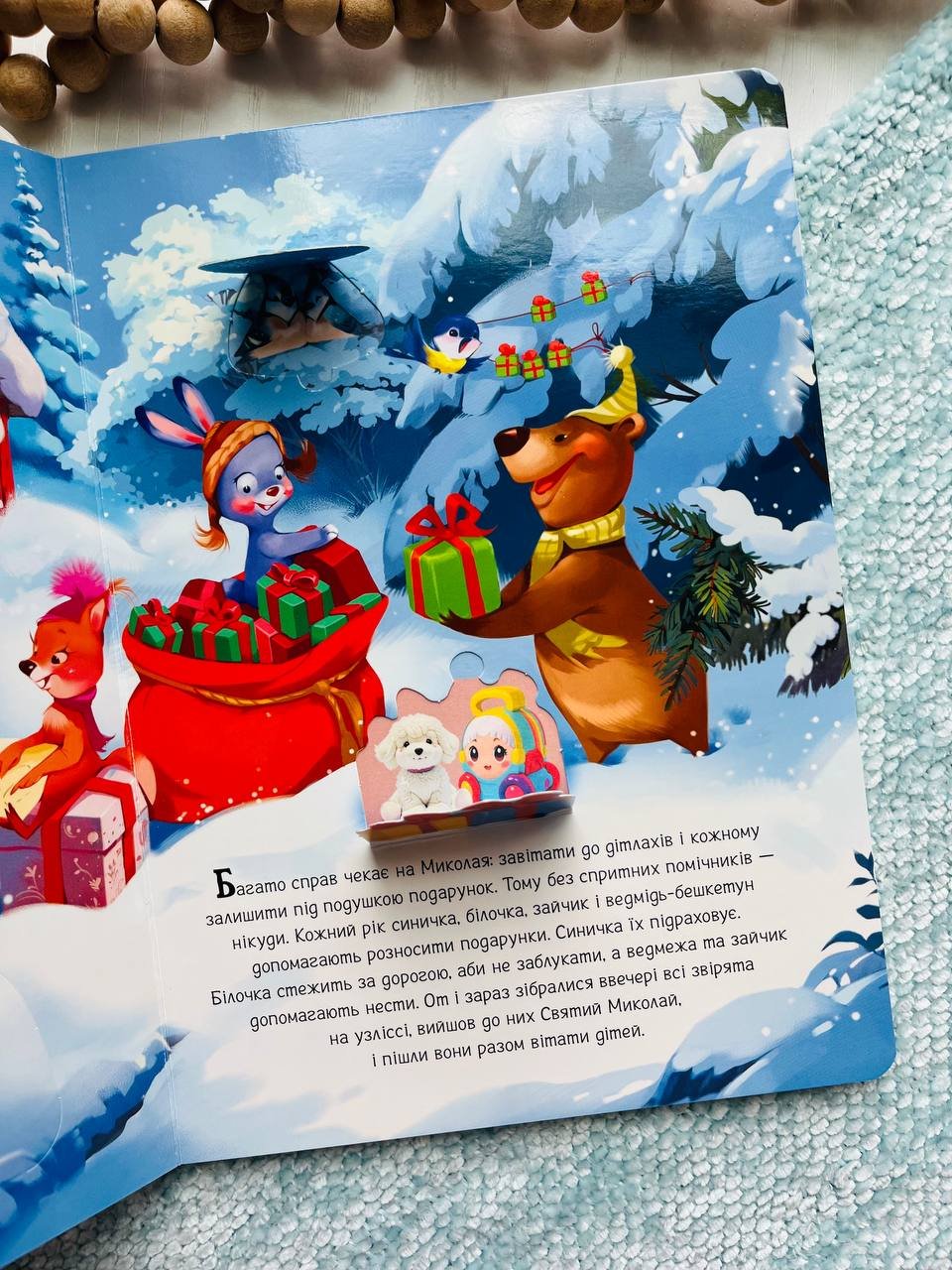 Щороку на початку зими Святий Миколай збирає подарунки для діточок. За одну ніч йому треба обійти всю країну і кожній дитині покласти під подушку омріяний подарунок. Звісно, у Святого Миколая є вірні помічники – лісові звірята. Та чи встигне він цього року завітати до всіх дітей до світанку? Які пригоди чекають на Святого Миколая та його друзів? Швидше відкривай книжку, щоб відчути атмосферу свята, зазирнути у потаємні віконця на кожній сторінці та разом з героями радісно зустрічати Святого Миколая.
