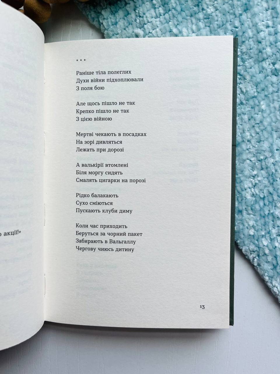 Живі та мертві, валькірії та духи війни, забутий Бог і втомлений Сатана. Ті, що чекають, і ті, кого вже ніхто не дочекається. Смерть, яка ховається просто під ліжком. Поранені, кава, турнікети, миші в окопах. Дні, схожі один на одного, як близнюки. «Нема ніякої долі. Не було ніякої змови. Просто деякі люди народились. Просто деяких людей не стало».