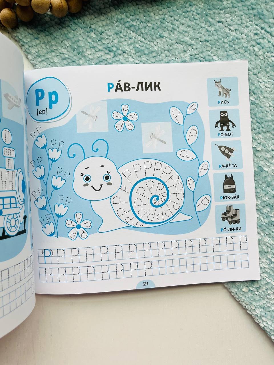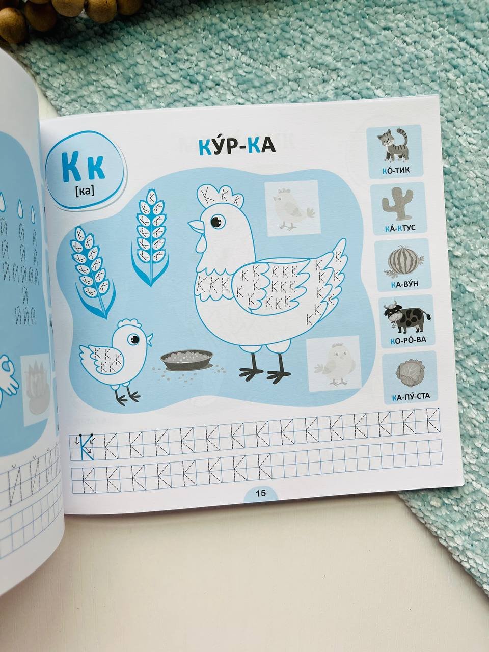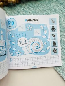 Цей зошит містить прописи букв українського алфавіту. На кожній сторінці на дитину чекає асоціативний малюнок до літери, який потрібно навести по пунктиру й розфарбувати, а ще — прописи зі зразком написання певної букви та слова, подані по складах для читання. Урізноманітнять роботу з виданням тематичні наліпки та цікаві завдання, які допоможуть перевірити навички читання, знання графічного зображення літер та уміння їх писати.