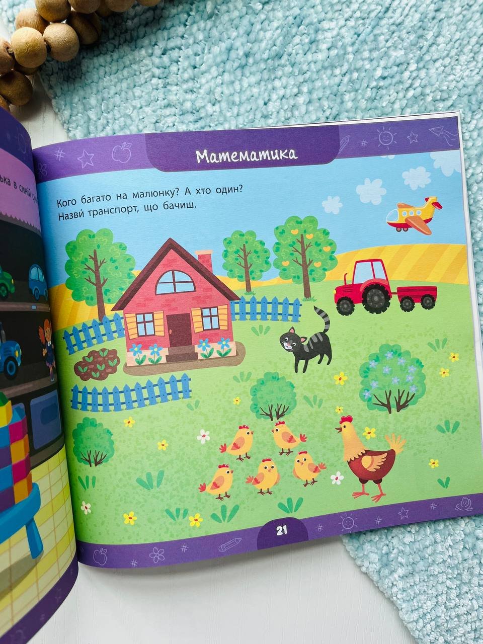 Ця книжка допоможе вам організувати пізнавальне й захопливе дозвілля для малюка. Яскраві ілюстрації привернуть його увагу, цікаві завдання допоможуть пізнати світ, запам’ятати щось нове, розвинути увагу й мислення, а робота з наліпками сприятиме покращанню дрібної моторики. Матеріал у кожному розділі подано від простого до складного, а кмітливі персонажі, що мандрують сторінками книжки, заохочуватимуть малюка виконувати їх.Видання призначене для спільної роботи дорослих з дітьми дошкільного віку.