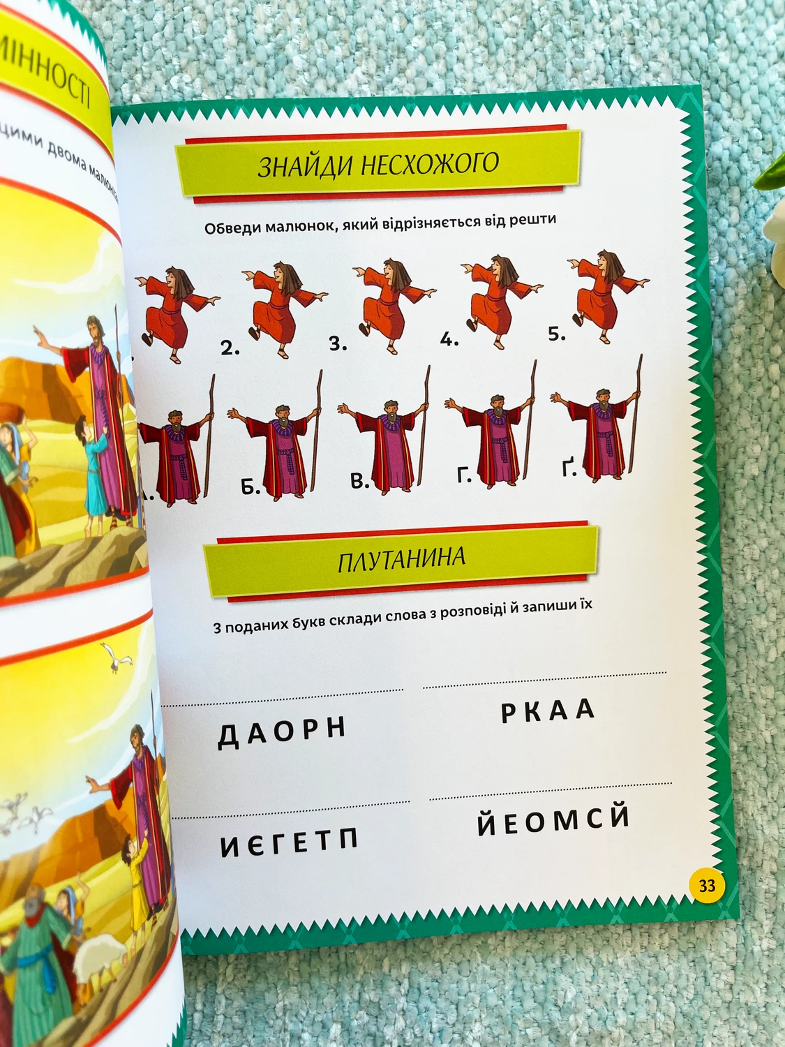 Книга побудована так, щоб сприяти активній участі дітей у вивченні біблійних історій і наданні їм можливості виразити свої думки через творчість. Завдання сприяють розвитку уяви, координації рухів та навичок вирішення проблем. За допомогою наліпок малеча може самостійно створювати ілюстрації, що робить процес навчання ще більш захоплюючим і цікавим.