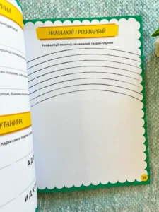 Кожна сторінка наповнена завданнями та іграми, що розвивають логічне мислення, увагу та пам’ять малечі. Діти можуть відгадувати головоломки, виконувати малюнки, шукати різні деталі на картинках і навіть збирати наліпки, що додають елемент гри та взаємодії.